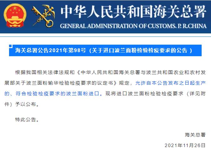 2021年11月26日,海關總署公布2021年第98號公告:允許自本公告發布之日起生產的、符合檢驗檢疫要求的波蘭面粉進口。