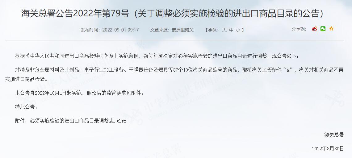 海關總署公告2022年第79號(關于調整必須實施檢驗的進出口商品目錄的公告)